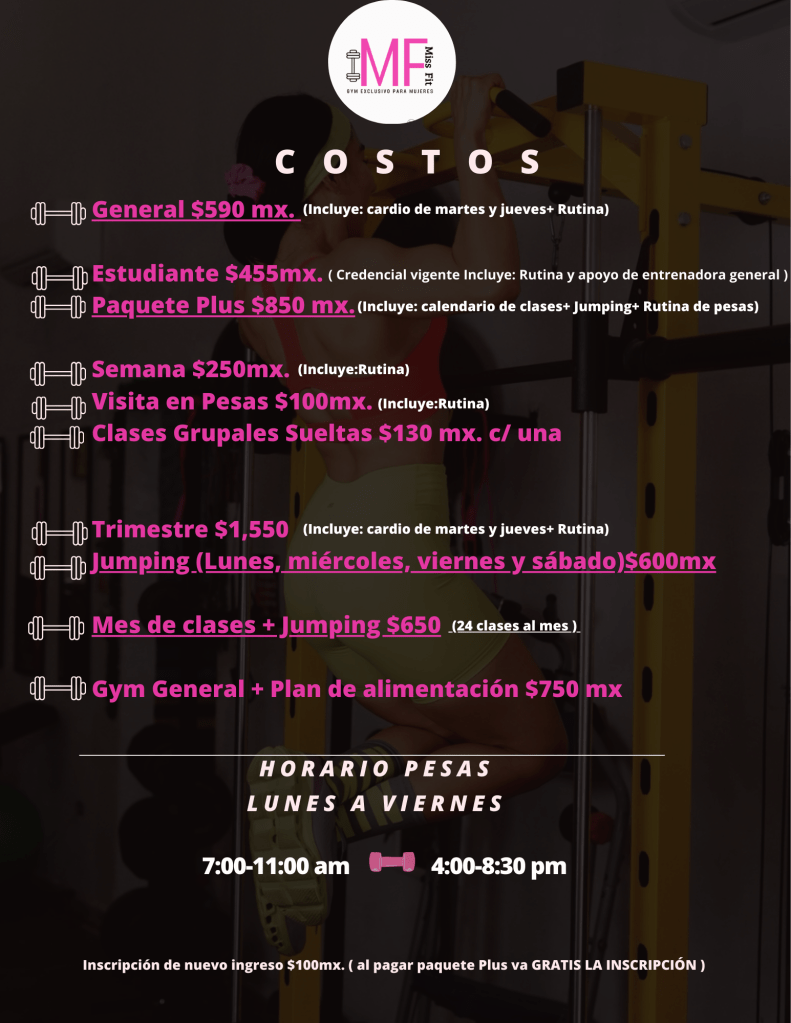Hola, Somos MISS FIT 💖, un gimnasio exclusivo para mujeres 👩🏻 , y estamos aquí para que nos tengas más cerquitas de tí o nos conozcas 💪🏼